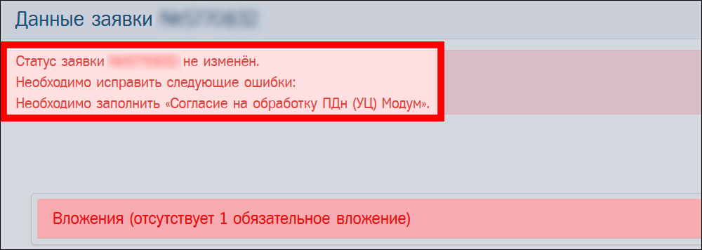 При попытке перевести электронную заявку без вложений «Согласие на обработку ПДн (карта тахографа)» и/или «Согласие на обработку ПДн (УЦ) Модум» в статус «Данные проверены» система выдаст сообщение об ошибке.