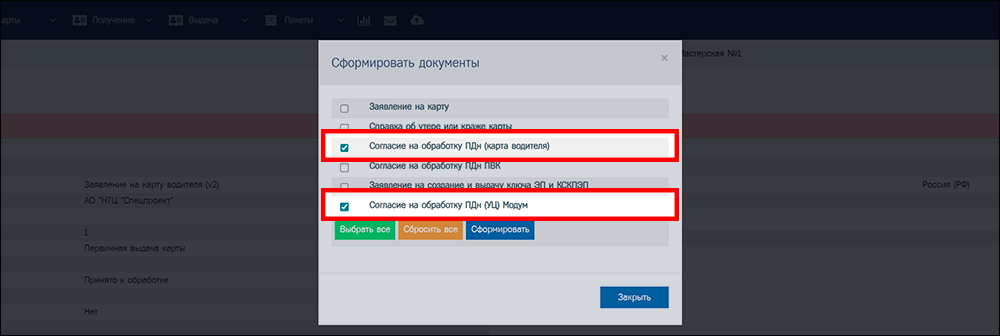 С помощью диалогового окна «Сформировать документы» в электронной заявке на карту тахографа можно сформировать оба обязательных документа.
