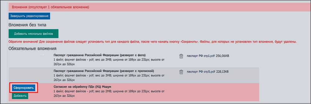 7. Отсканируйте подписанный документ и загрузите во вложения. Сформированный документ появится в списке вложений.