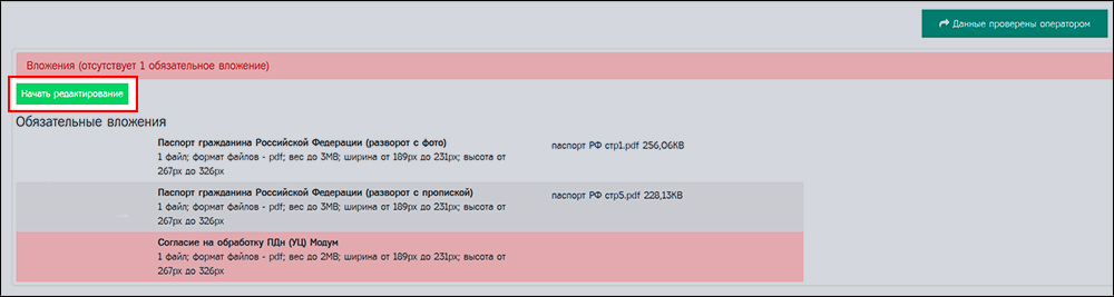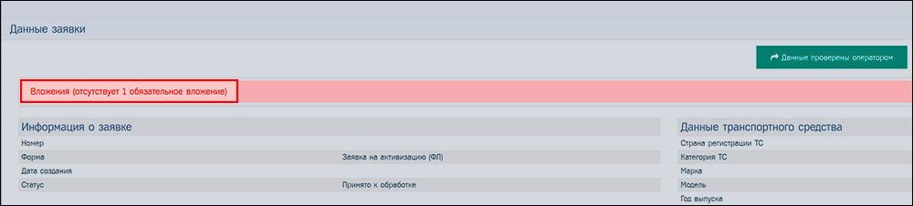 При попытке перевести заявку без вложения «Согласие на обработку ПДн (УЦ) Модум» в статус «Данные проверены» / «Данные проверены оператором» система выдаст сообщение об ошибке.
