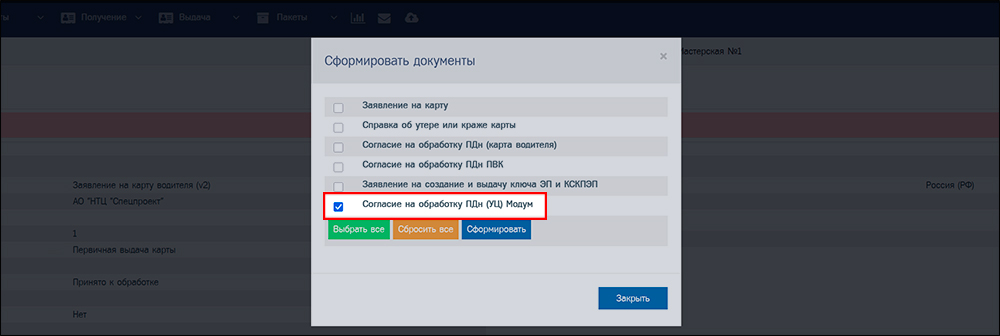 4. В открывшемся диалоговом окне выберите «Согласие на обработку ПДн (УЦ) Модум» и нажмите кнопку «Сформировать».